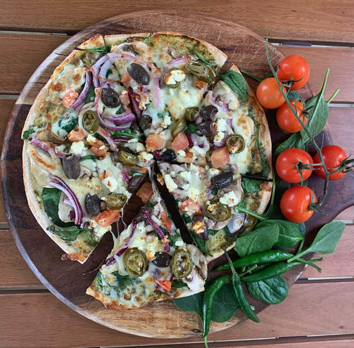Pesto base, garlic, sundried tomato, spinach, jalapeno, fresh tomato, mushroom, feta, onion & kalamata olives.
